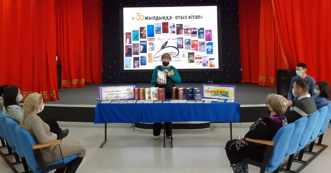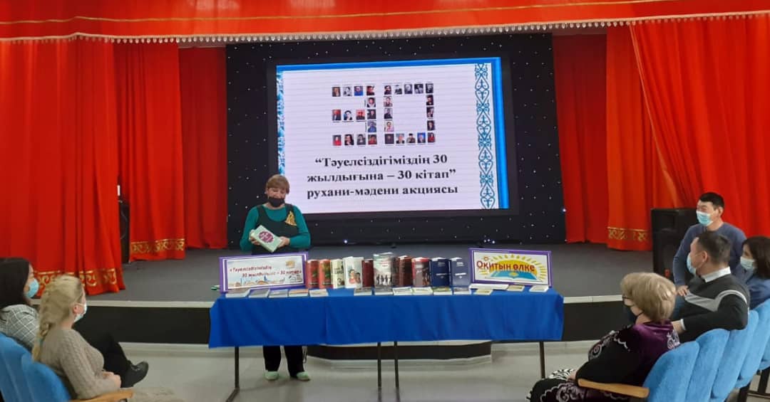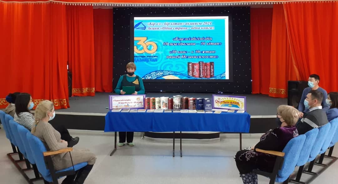 Біздің мемлекетте көп жылдан бері "Бір ел-бір кітап" атты акция жүргізілуде. Кітаптың оқылуы, мемлекетімізде оқырмандардың бірігуіне және Отанымыздың ең жақсы әдебиетіне көңіл аударды. Қазақстан Тәуелсіздігінің 30 жылдығында акция өткізу реті өзгертілген. Біз биыл Қазақстан авторларының ең жақсы отыз шығармаларын,поэзияларын, прозаларын, драммаларын,балалар әдебиеттерін және аудармаларды оқып шықтық. Жыл бойына оқырмандармен осы шығармаларды оқу және түсіндіру жұмыстары жөнінде әр түрлі іс-шаралар өткізілді. Бүгін соңғы іс-шара өткізілді. Библиотека меңгерушісі Слинченко В.А әдебиетке шолу жасады. Оқырмандар акцияға тіркелген кітаптар мен оқылған кітаптарды талқылады және олардың құндылығы жөнінде өз ойларымен бөлісті.Т.Жармагамбетовтың "Отамалы" атты кітабын оқып бітірген оқырман Орынбаев А, өз ойымен бөлісті. Аймукатова А - өзіне ұнаған М.Макатаевтың өлеңін оқып берді.