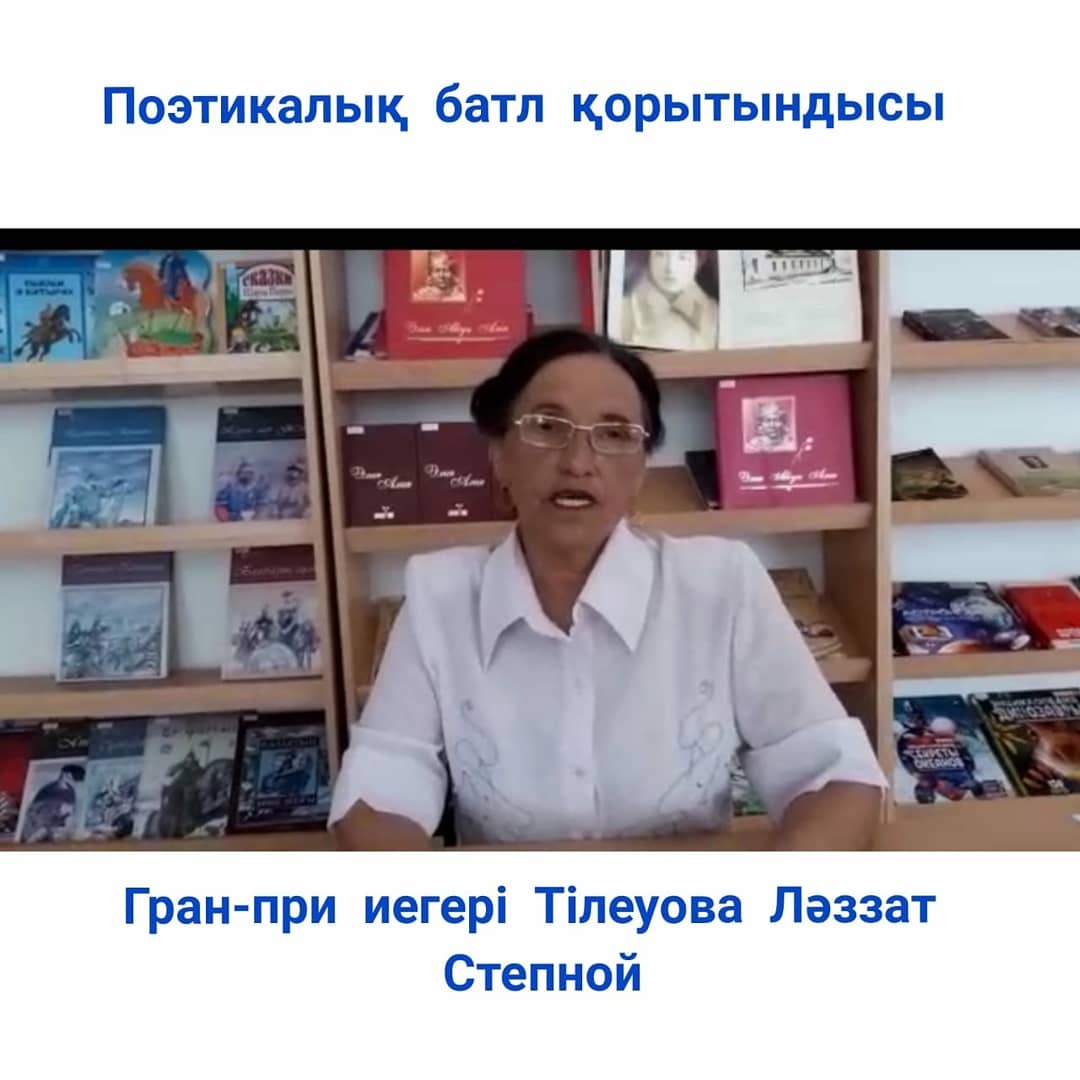 9-мамыр Жеңіс күні мерекесіне орай өткізілген "Ешкім де, ештеңе де ұмытылмайды" атты поэтикалық батлға аудан орталығынан сайланған әділ қазы мүшелерінің шешімі бойынша Гран-при иегері Тілеуова Ләззат Степной модельді ауылдық кітапханасының оқырманы.