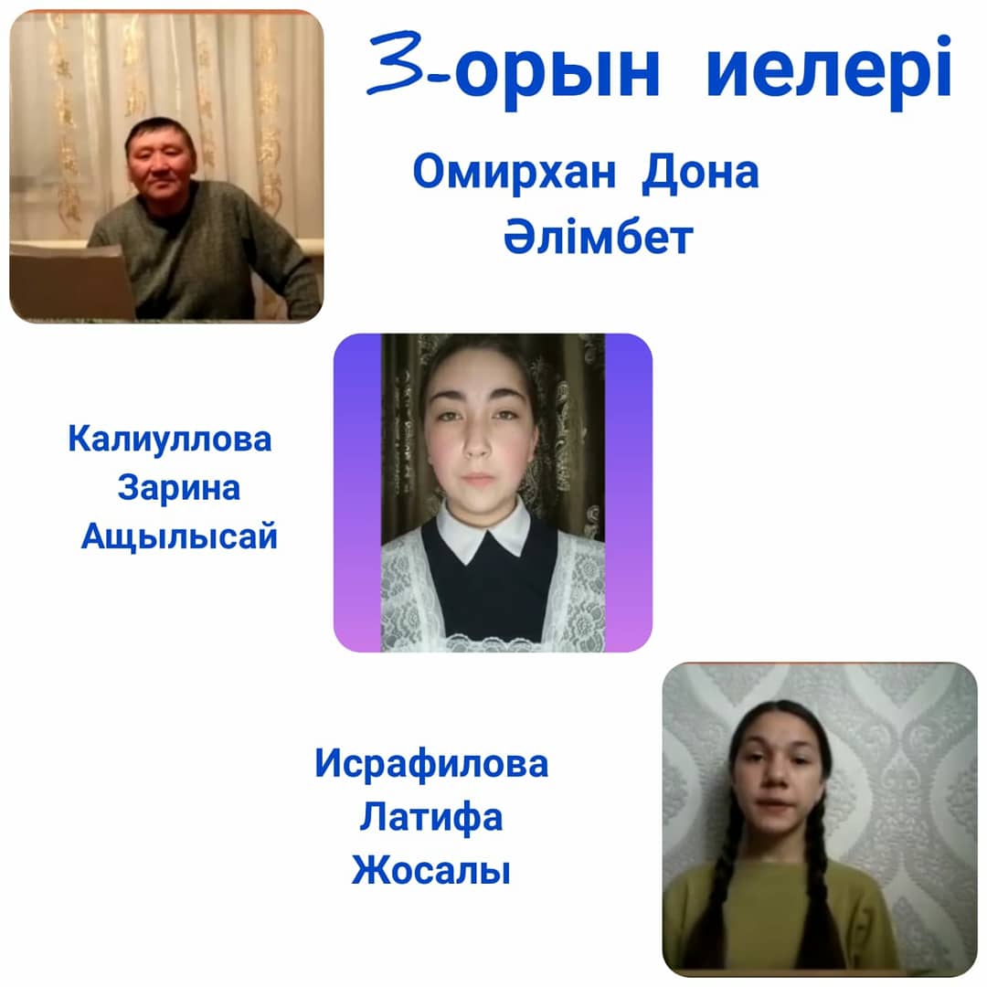 3 орын - Омирхан Дона Әлімбет модельді ауылдық кітапханасының оқырманы, Калиуллова Зарина Ащылысай модельді ауылдық кітапханасының оқырманы және Исрафилова Латифа Жосалы ауылдық кітапханасының оқырманы иеленді.