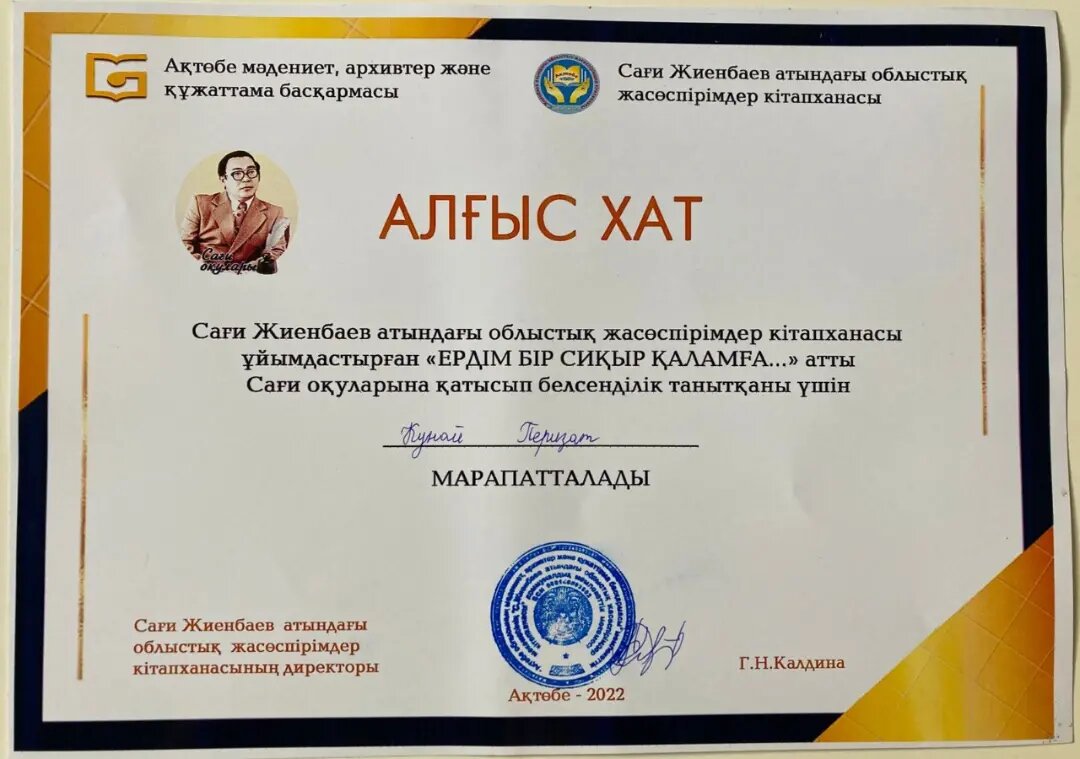 Күнай Перизат, Қарғалы аудандық орталық кітапханасының кітапханашысы, 16 мамыр күні Облыстық жасөспірімдер кітапханасының ұйымдастыруымен өткен "Ердім бір сиқырлы қаламға" атты Сағи оқуларына қатысып, Алғыс хатқа ие болды.