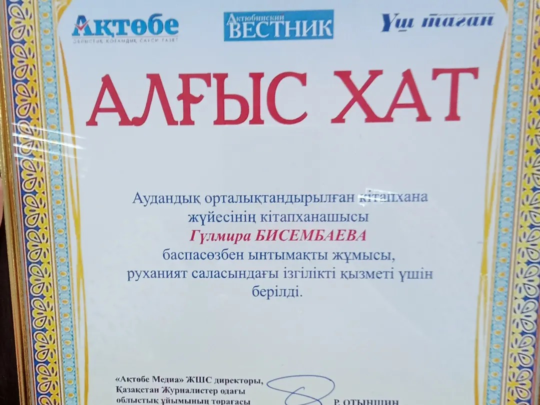 Аудан әкімдігінің ғимаратында өткен кездесу барысында Қарғалы аудандық орталық кітапханасының библиографы Бисембаева Гүлмира Ахметкереевна "Ақтөбе Медиа" ЖШС директоры, Қазақстан Журналистер одағы облыстық ұйымының төрағасы тарапынан баспасөз ынтымақты жұмысы, руханият саласындағы ізгілікті қызметі үшін Алғыс хатпен марапатталды. Марапатыңыз құтты болсын.🤝💐