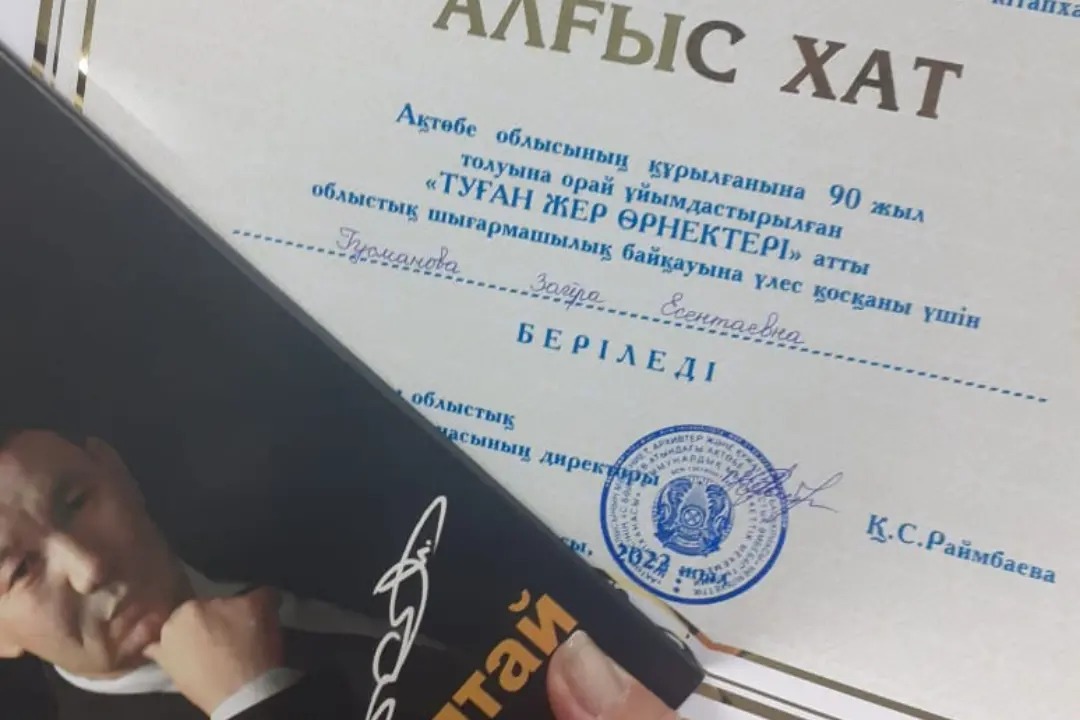 20 қыркүйек күні С.Бәйішев атындағы Ақтөбе облыстық әмбебап ғылыми кітапханасында, Ақтөбе облысының құрылғанына 90 жыл толуына орай ұйымдастырылған "Туған жер өрнектері" атты облыстық шығармашылық байқауына кітапханашы З.Гусманованың жетекшілігімен 10 кл оқушысы А.Сеитова қатысты. Байқаудың талабына сай 15-29 жас аралығында облыс бойынша, 30 қатысушы арасынан "Алғыс хаттармен", бағалы сыйлықтармен марапатталды. Құттықтаймыз!!!