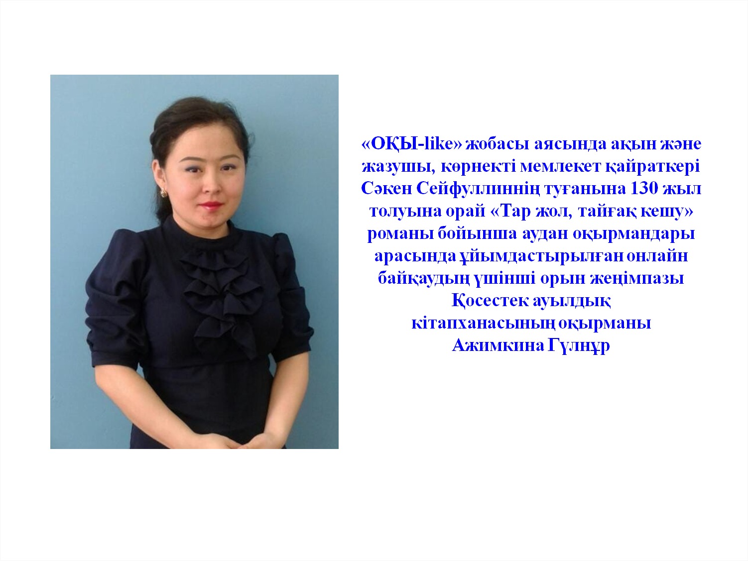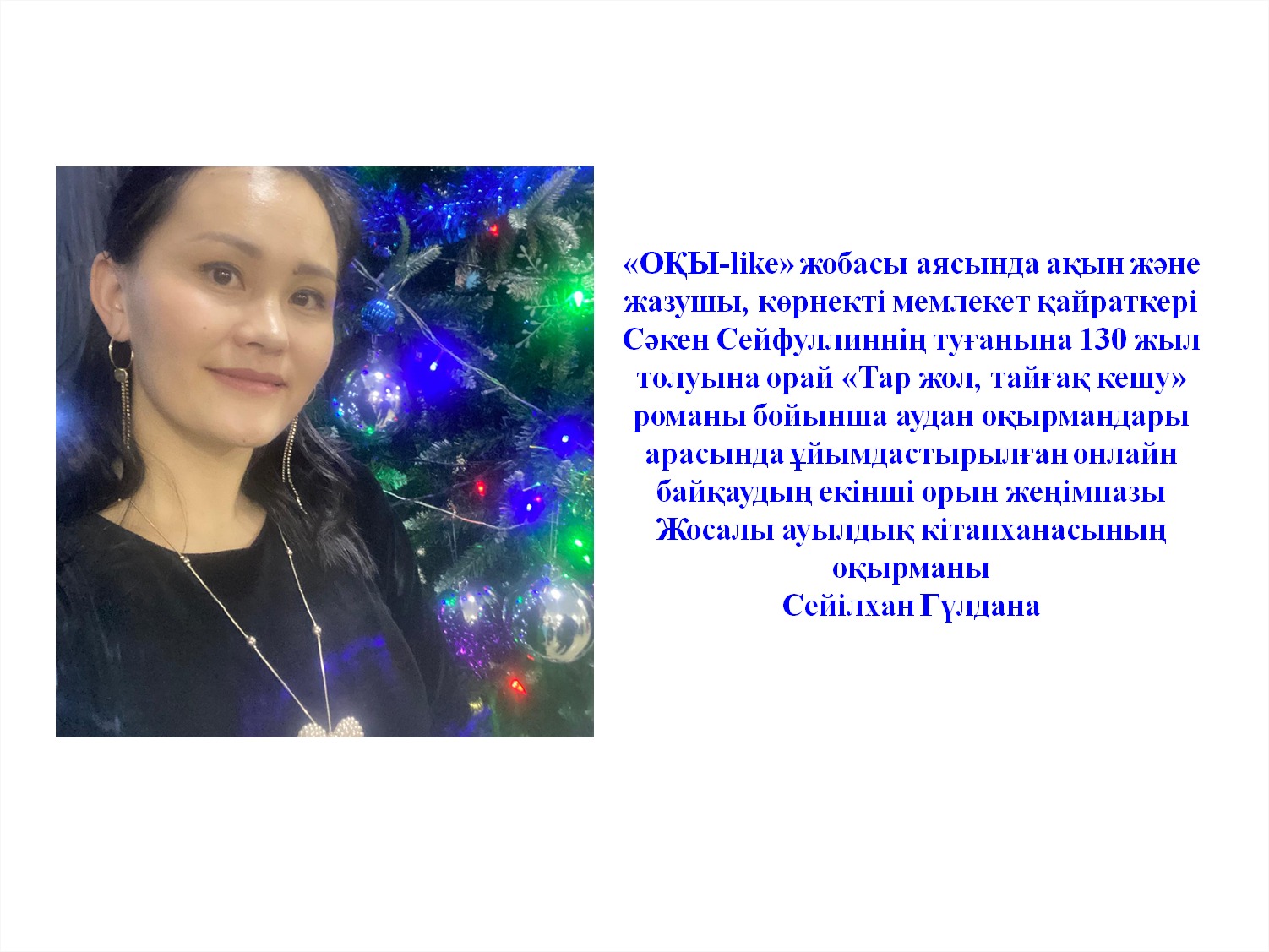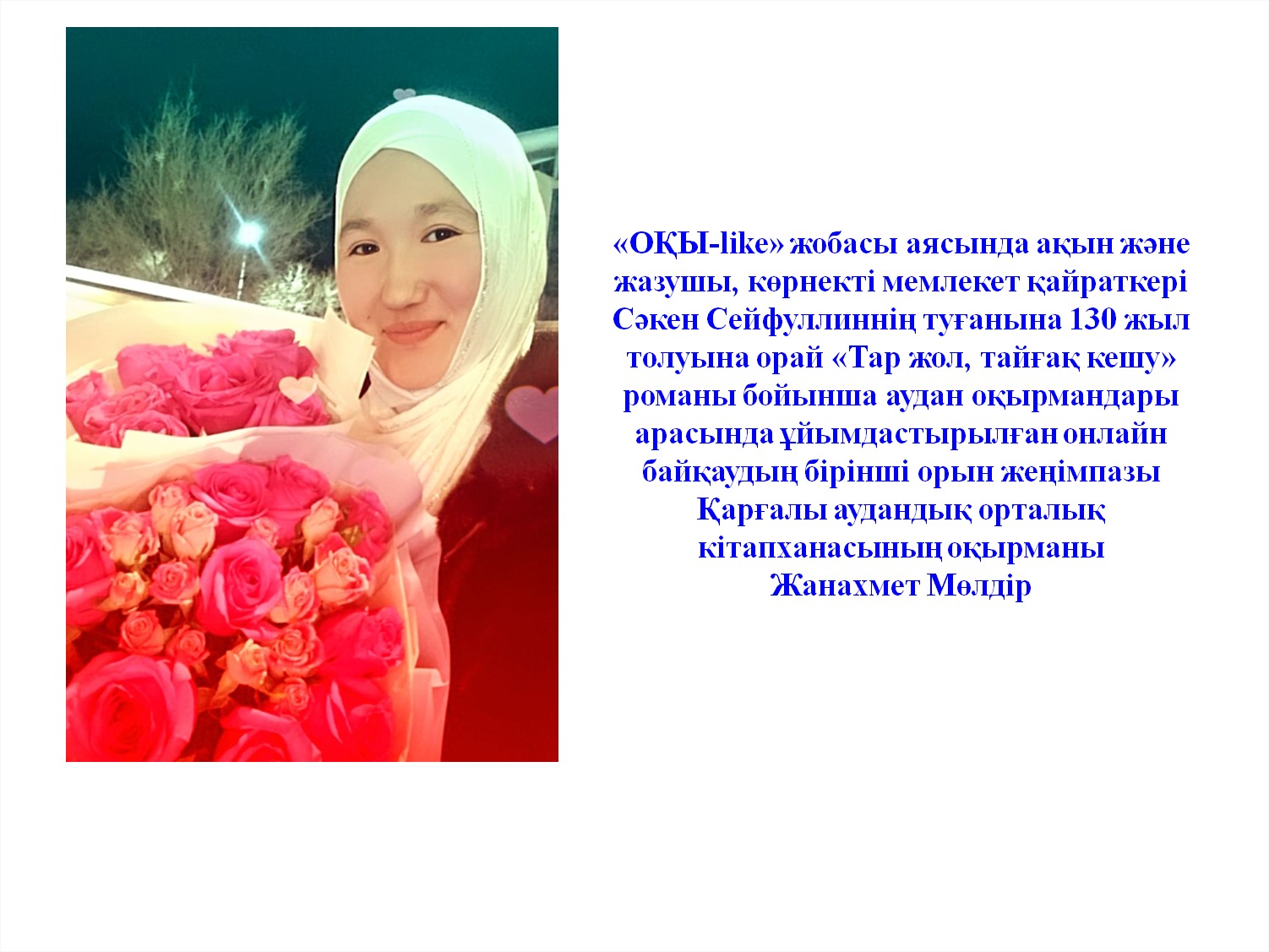 15 наурызда Қарғалы аудандық орталық кітапханасы «ОҚЫ-like» жобасы аясында ақын және жазушы, көрнекті мемлекет қайраткері Сәкен Сейфуллиннің туғанына 130 жыл толуына орай «Тар жол, тайғақ кешу» романы бойынша аудан оқырмандары арасында онлайн байқау ұйымдастырды. Мақсаты: Қоғам арасында кітап оқуды қалыптастыру, кітапты құрметтеуге тәрбиелеу. Сәкен Сейфуллиннің шығармаларын көпшілік арасында насихаттау. Оқырмандардың арасында автордың шығармасына деген қызығушылықты арттыру. Байқауға Қарғалы ауданының оқырмандары қатысты. Қатысушылар Сәкен Сейфуллиннің «Тар жол, тайғақ кешу» романы бойынша құрастырылған тест сұрақтарына жауап берді. байқау нәтижесі бойынша Қарғалы аудандық орталық кітапханасының оқырманы Жанахмет Мөлдір бірінші орынға, Жосалы ауылдық кітапханасының оқырманы Сейілхан Гүлдана екінші орынға, Қосестек ауылдық кітапханасының оқырманы Ажимкина Гүлнұр үшінші орынға ие болды. Жүзден жүйрік шыққан жеңімпаздар дипломдармен, сыйлықтармен марапатталды. Жүлделеріңіз құтты болсын жеңімпаздар!