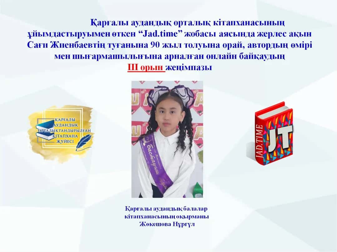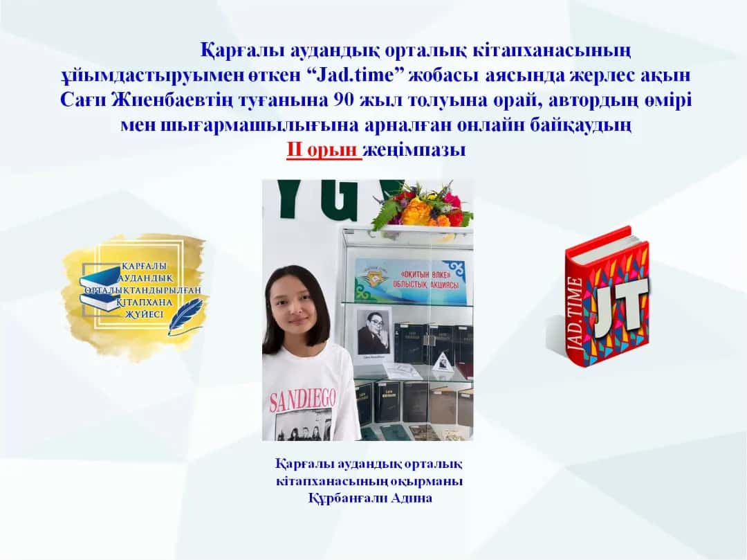 19 маусымда Қарғалы аудандық орталық кітапханасының ұйымдастыруымен «Jad.time» жобасы аясында жерлес ақын Сағи Жиенбаевтің туғанына 90 жыл толуына орай ақынның шығармалары мен өміріне арналған ақпараттар бойынша оқырмандар арасында өткен аудандық онлайн бейнеролик жасау байқаудың қорытындысы жарияланды. Мақсаты: Қоғам арасында кітап оқуды қалыптастыру, кітапты құрметтеуге тәрбиелеу. Облыстық «Оқитын өлке» акциясы аясында таңдалған Сағи Жиенбаевтің шығармаларын көпшілік арасында насихаттау. оқырмандардың арасында автордың шығармасына деген қызығушылықты арттыру.
