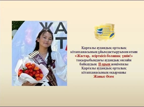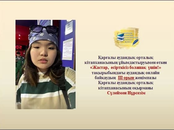 Қарғалы аудандық орталық кітапханасы есірткі заттарының таралуы мен қолданылуының алдын алу, сондай-ақ жастар ортасында нашақорлық проблемасына назар аудару және салауатты өмір салтын насихаттау мақсатында «Жастар, есірткісіз болашақ үшін!» тақырыбында ұйымдастырған аудандық бейнеролик жасау байқауының жеңімпаздары.
